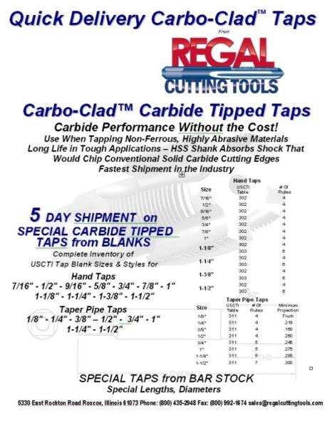 Carbide and Carbo-Clad taps are available in up to 1” diameter and pipe sizes of up to 1 ½”. For more information about these taps, contact us today.